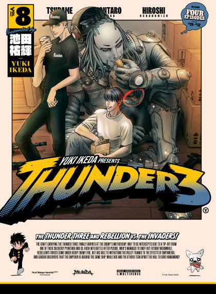 The craft carrying the Thunder Three finally arrives at the enemy's mothership, only to be intercepted due to a tip-off from one of their soldiers! Pyontaro and co. rush into battle after Pusuke, who's managed to sniff out Futaba! Meanwhile, Rebellion's forces come under heavy enemy fire, but are able to withstand the volley thanks to the effects of Empoweral. And Gaudou discovers that the emperor is aboard the same ship, while Doc and the others tear apart the hull to save humankind!