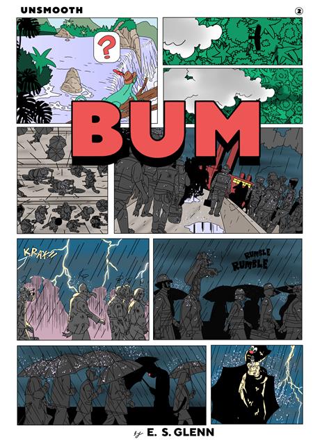 E.S. Glenn explores his existential angst in this extraordinary prequel to his debut graphic novel, Unsmooth. A form busting allegorical fever dream, Unsmooth 2: BUM is a poetic journey through the human condition, featuring a cast of characters who range from poets to prisoners—from assassins, to artists... The oversized 88 page issue flows seamlessly between reality and metaphor in 8 visually stunning chapters. This standout work proclaims Glenn's status as a rising star in comics.